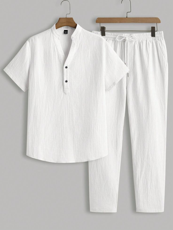 Conjunto de camisa de verano para hombre de manga corta y cuello en V con muesca y pantalones largos tejidos informales 460.00 MXN 0.00 MXN